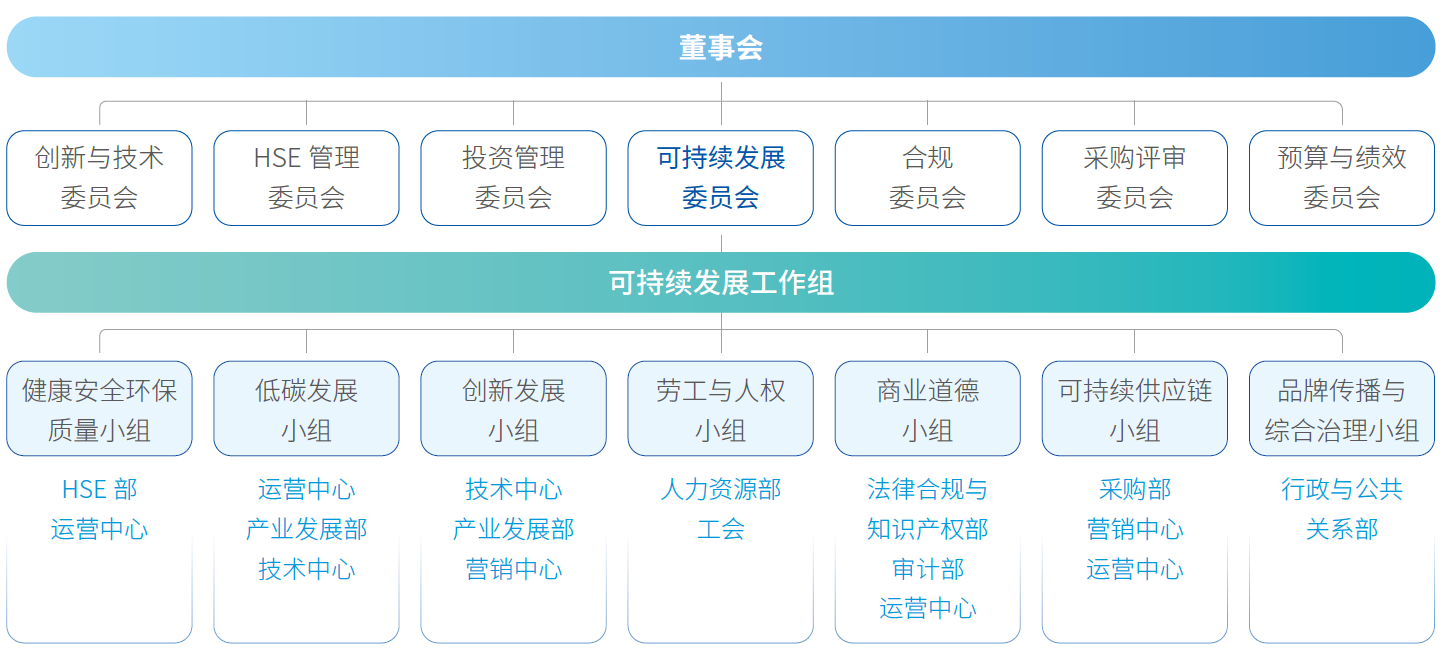 可持续发展委员会作为公司可持续发展工作主要责任机构,负责审议可持续发展工作总体战略、目标、整体规划与绩效等。委员会下设可持续发展工作组,由公司副总裁担任组长,组员包括相关部门负责人。可持续发展工作组下设健康安全环保质量、低碳发展、创新发展、劳工与人权、商业道德、可持续供应链、品牌传播与综合治理共7个工作小组,包含HSE部、运营中心、产业发展部、技术中心、营销中心、人力资源部、工会、法律合规与知识产权部、审计部、采购部、行政与公共关系部等主要职能部门,对公司可持续发展事宜承担具体责任,每年检讨具体议题可持续发展政策及目标完成情况。