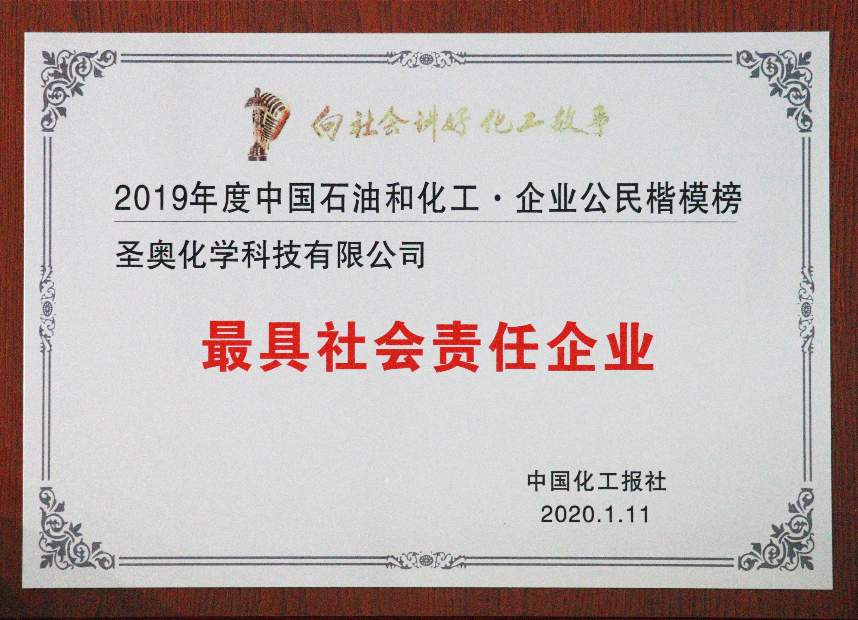 近年来,圣奥化学以“科学至上 创新致远”为核心价值观,以“引领聚合物添加剂行业的绿色发展”为驱动力,积极探索和寻求新的战略突破和转型升级,在科技创新、节能减排、安全环保等方面表现突出,并积极推动社区文化、教育、环保、社会公益等事业的发展,曾荣获2013年度“企业公民楷模·绿色化工奖”、2014年度“企业公民楷模·节能减排奖”、2016年度和2018年度“企业公民楷模·最具社会责任企业”。