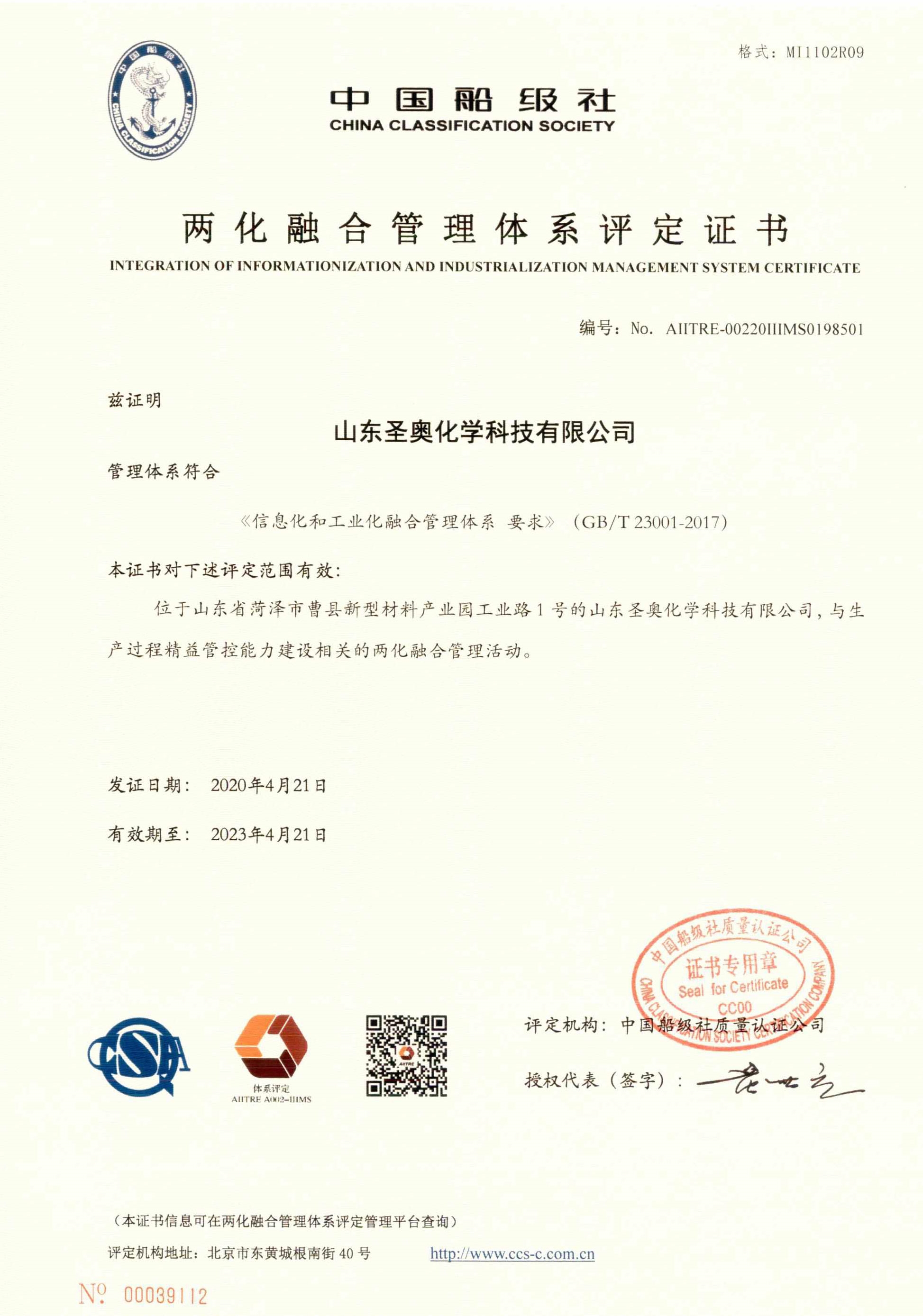 4月21日,山东圣奥正式通过国家工业和信息化部《信息化和工业化融合管理体系要求》(GB/T 23001-2017)体系认证,标志着山东圣奥在推进信息化和工业化深度融合方面进入新阶段,这是继安徽圣奥2018年9月入选之后,圣奥化学旗下第二家子公司成功通过国家两化融合管理体系认证。