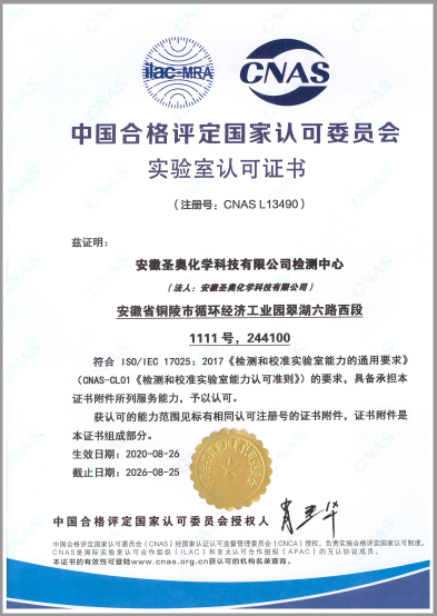 日前,安徽圣奥检测中心通过中国合格评定国家认可委员会(英文缩写CNAS)认可,跻身国际及国家认可的实验室行列,这也是继泰安圣奥、山东圣奥分别于2018和2019年获得CNAS认可后,圣奥化学旗下第三家通过此认可的子公司。
