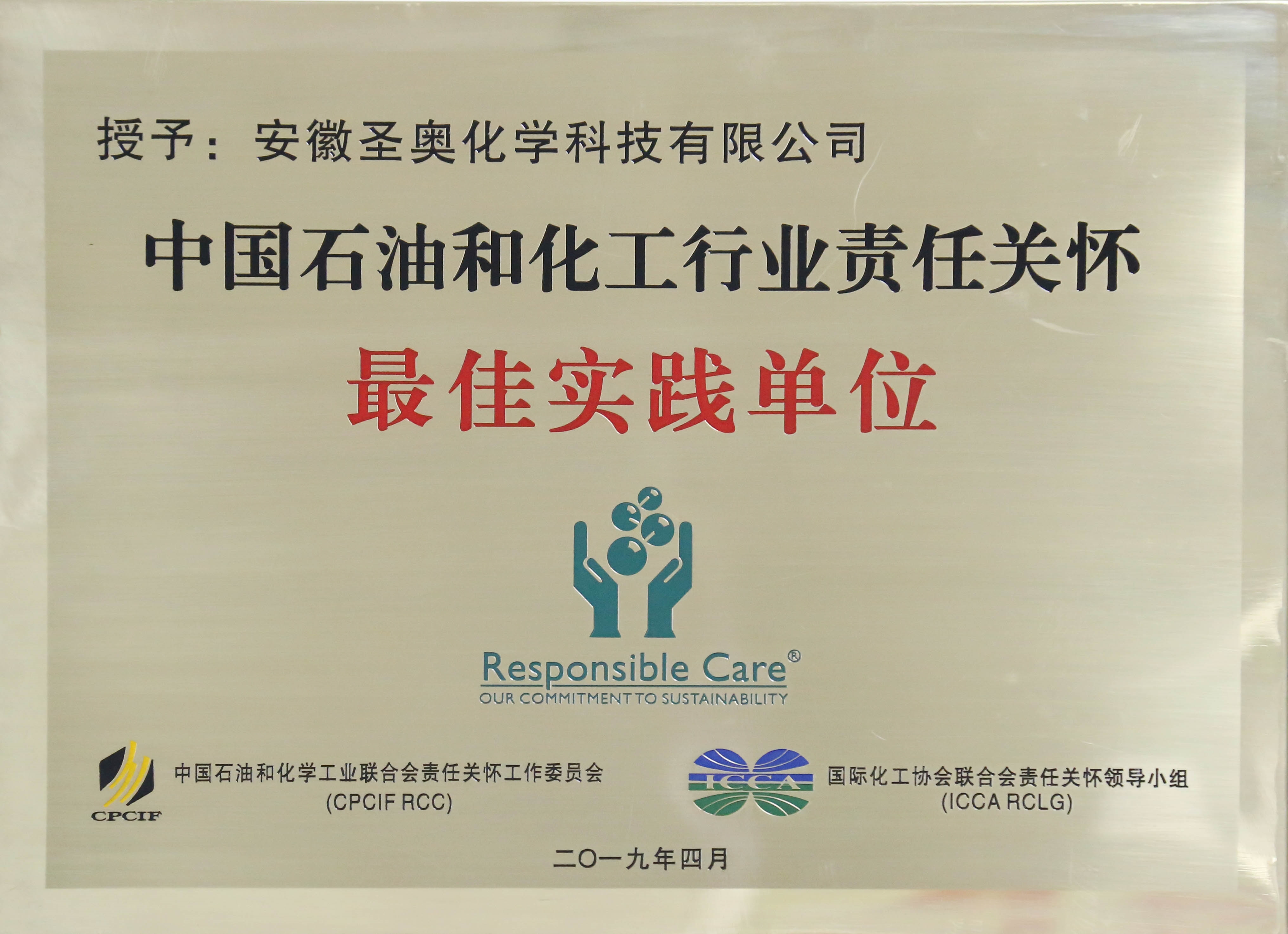 安徽圣奥始终坚持“开放与关怀”、“承担责任与敬业”的企业核心价值观,把责任关怀理念引入到日常管理中。在致力于企业发展的同时,积极主动履行社会责任,倡导“企业的发展必须以保护环境为准则”的理念,以更具社会责任感的企业行为增强竞争优势,致力于成为卓越的企业公民。安徽圣奥将经济上的成长与社会责任、环境保护相结合,同时将责任关怀体系精化、细化,融入到企业活动的方方面面。获得“中国石油和化工行业责任关怀最佳实践单位”这一荣誉,既是对安徽圣奥责任关怀工作的肯定,同时也对安徽圣奥进一步提升安全环保、履行社会责任等各项工作提出了更高的要求。