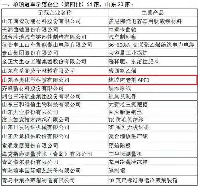 11月27日,国家工业和信息化部、中国工业经济联合会公布了第四批制造业单项冠军示范企业名单,山东圣奥凭借产品橡胶防老剂6PPD成功入选,成为全国64家第四批单项冠军示范企业之一。这是山东圣奥继今年1月入选山东省制造业单项冠军企业名单后获得的又一殊荣。