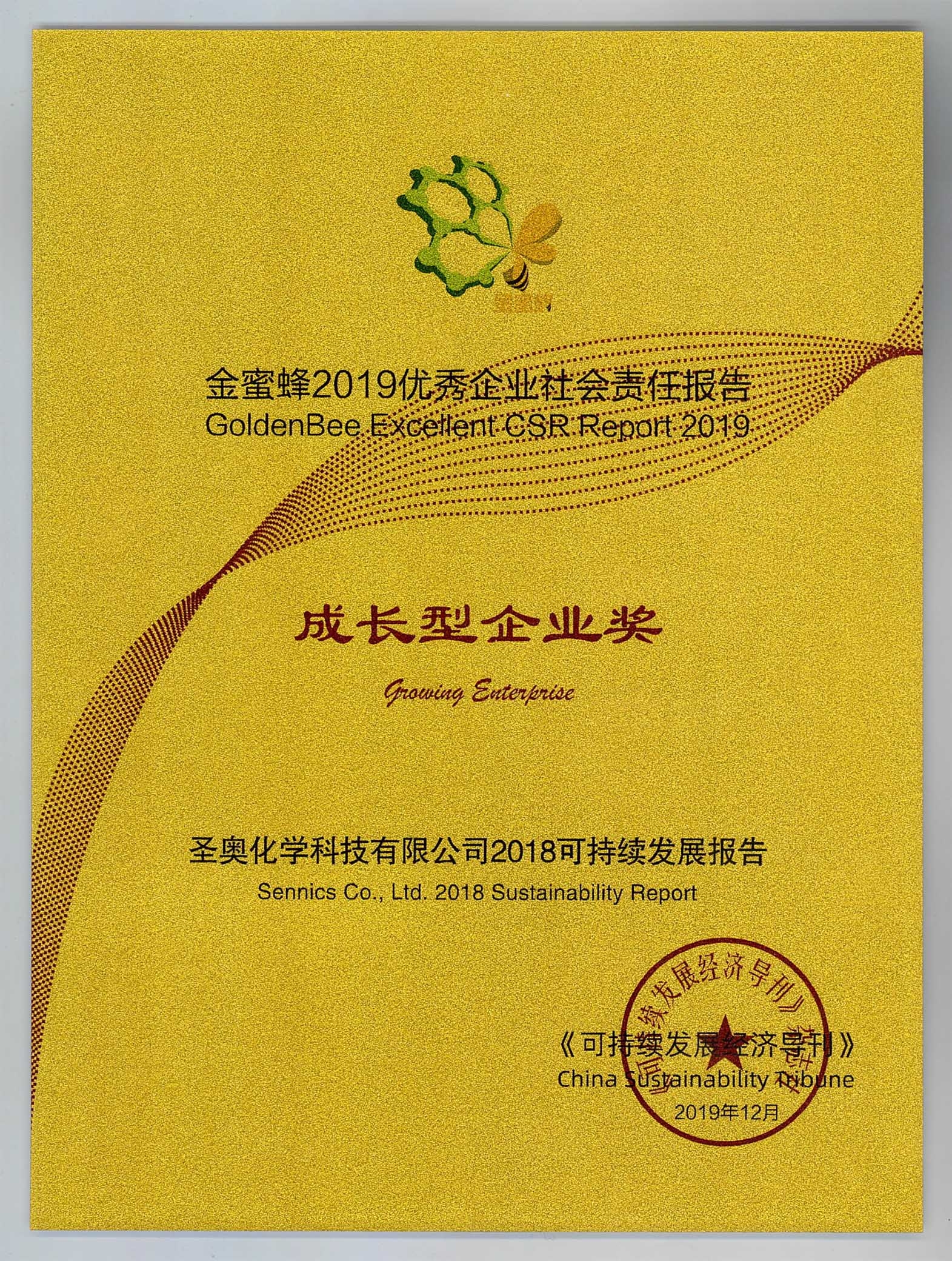 12月5日,由《可持续发展经济导刊》主办的第十二届中国企业社会责任报告国际研讨会在沪召开,会议发布“金蜜蜂2019优秀企业社会责任报告”名单,圣奥化学《2018可持续发展报告》榜上有名,并荣获“成长型企业奖”,这是圣奥化学可持续发展报告继2016年入围该奖项后再次获奖,标志着公司的可持续发展报告已达到行业领先水平。