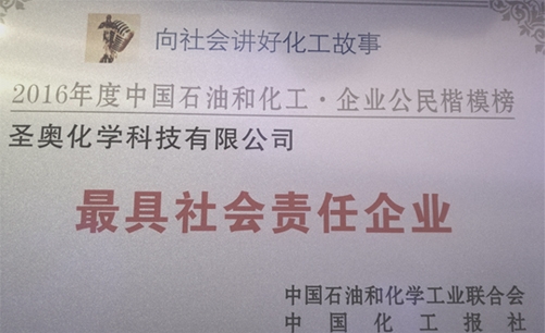 1月15日,由中国石油和化学工业联合会和中国化工报社联合主办,主题为“向社会讲好化工故事”的行业盛典在北京隆重举行,圣奥化学荣获“最具社会责任企业”称号。
