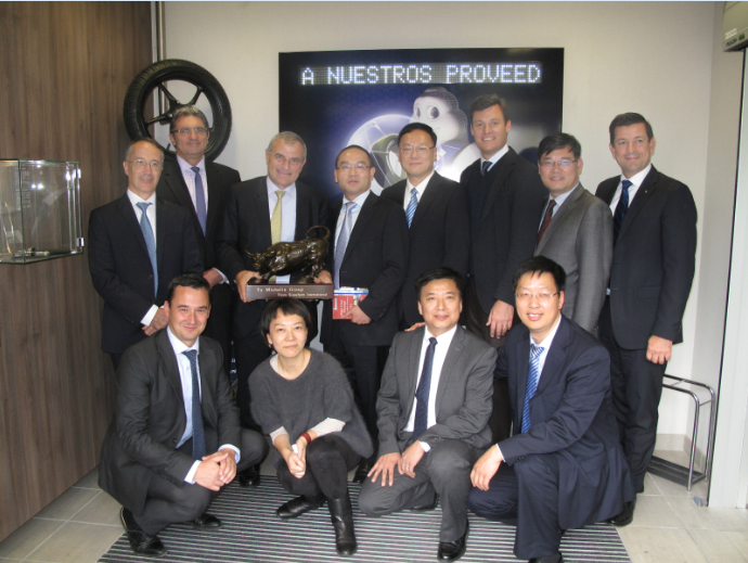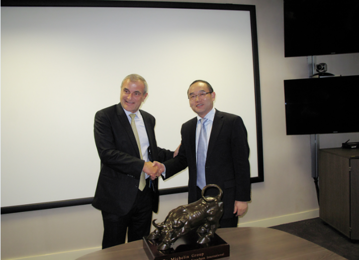 10月17日至18日,中化国际总经理兼圣奥化学董事长覃衡德率团拜访了位于法国克莱蒙费朗的米其林轮胎公司总部,与米其林集团高级副总裁兼首席采购官Luc Minguet先生等高层会晤,双方就共同推进在天然橡胶及橡胶化学品领域的战略合作、践行企业社会责任、推动全球橡胶行业绿色可持续发展等话题进行了深入交流,并形成广泛共识。双方还就中国经济发展、2016年轮胎行业状况、中国企业全球化布局和并购等焦点问题交换了意见。中化国际下属新加坡合盛公司CEO Robert Meyer、圣奥化学CEO苏赋等相关人员陪同出访。