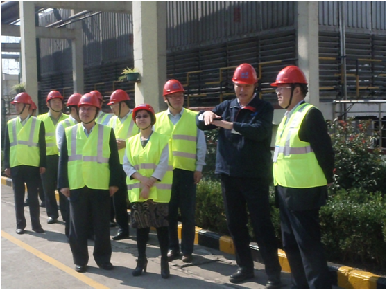 图为中化集团副总裁李彬一行在江苏圣奥管理层的陪同下实地调研铜陵工厂