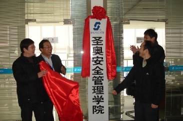 启动仪式结束后,杜邦安全专家徐兴、凯雷圣奥总经理焦仁平、泰安圣奥总经理武厉保、安徽圣奥总经理唐志民共同为“圣奥安全管理学院”揭牌。
