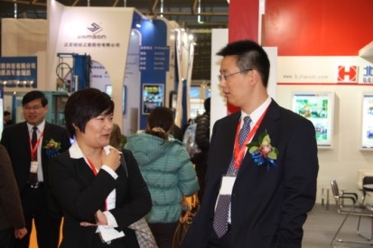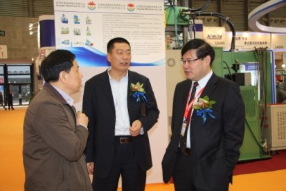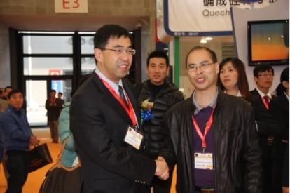江苏圣奥研发副总裁陈新民(右)与来宾交谈