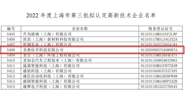 日前,上海市高新技术企业认定指导小组根据科技部、财政部、国家税务总局《高新技术企业认定管理办法》《高新技术企业认定管理工作指引》及《上海市高新技术企业认定管理实施办法》的有关规定,发布《2022年度上海市第三批符合认定条件拟认定高新技术企业名单》,圣奥化学通过层层申报和审核脱颖而出,荣获“高新技术企业”称号。