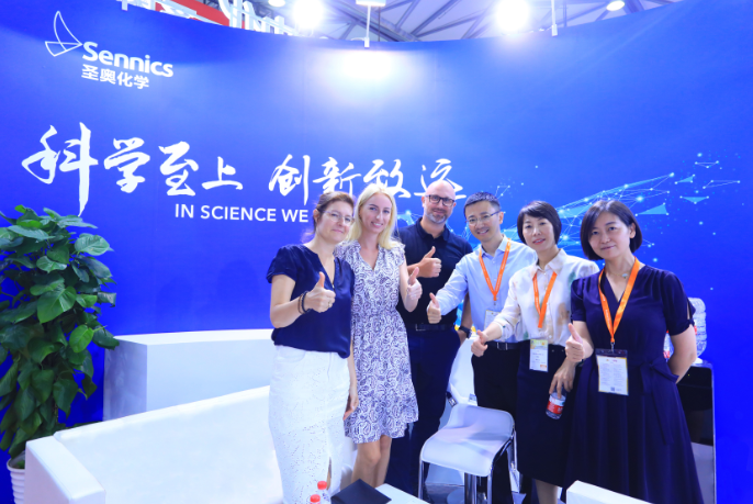 圣奥化学展台人头攒动,热闹非凡,来自欧洲、日本、韩国、印度及国内客户、采购商驻足了解公司产品技术、发展战略、环保理念和创新文化,希望圣奥化学能一直将绿色环保作为产品标签,坚持工艺技术创新、不断提升产品品质,保持供应稳定,大家对公司新产品和新项目建设表示关注。