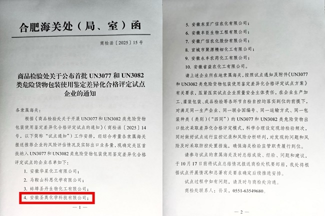 近日,合肥海关公布首批UN3077和UN3082类危险货物包装使用鉴定差异化合格评定试点企业名单,安徽圣奥成功入选,成为安徽省首批且铜陵市唯一试点企业。