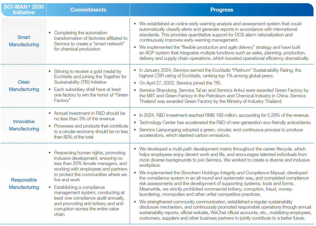 Sustainable development has become a global consensus and an inevitable choice to drive technological innovation, green development, and high-quality development of chemical companies. Sennics follows the core values of “Customer Orientation, Innovation and Continuous Improvement, Open minded and Caring for People, Teamwork and Collaboration, Taking Responsibility and Professional Dedication” and the innovative development concept on ultimate and sustainable growth. The Company actively builds the strategic goal of digital, intelligent and service-oriented transformation and upgrading with “Smart Sennics” as the core, in a continuous effort to fulfill the corporate mission of “Leading through Green Innovation”. We have comprehensively implemented the SCI-MAN+ 2030 Initiative and steadily moved towards the vision of “First Choice for Polymer Additives Worldwide”.